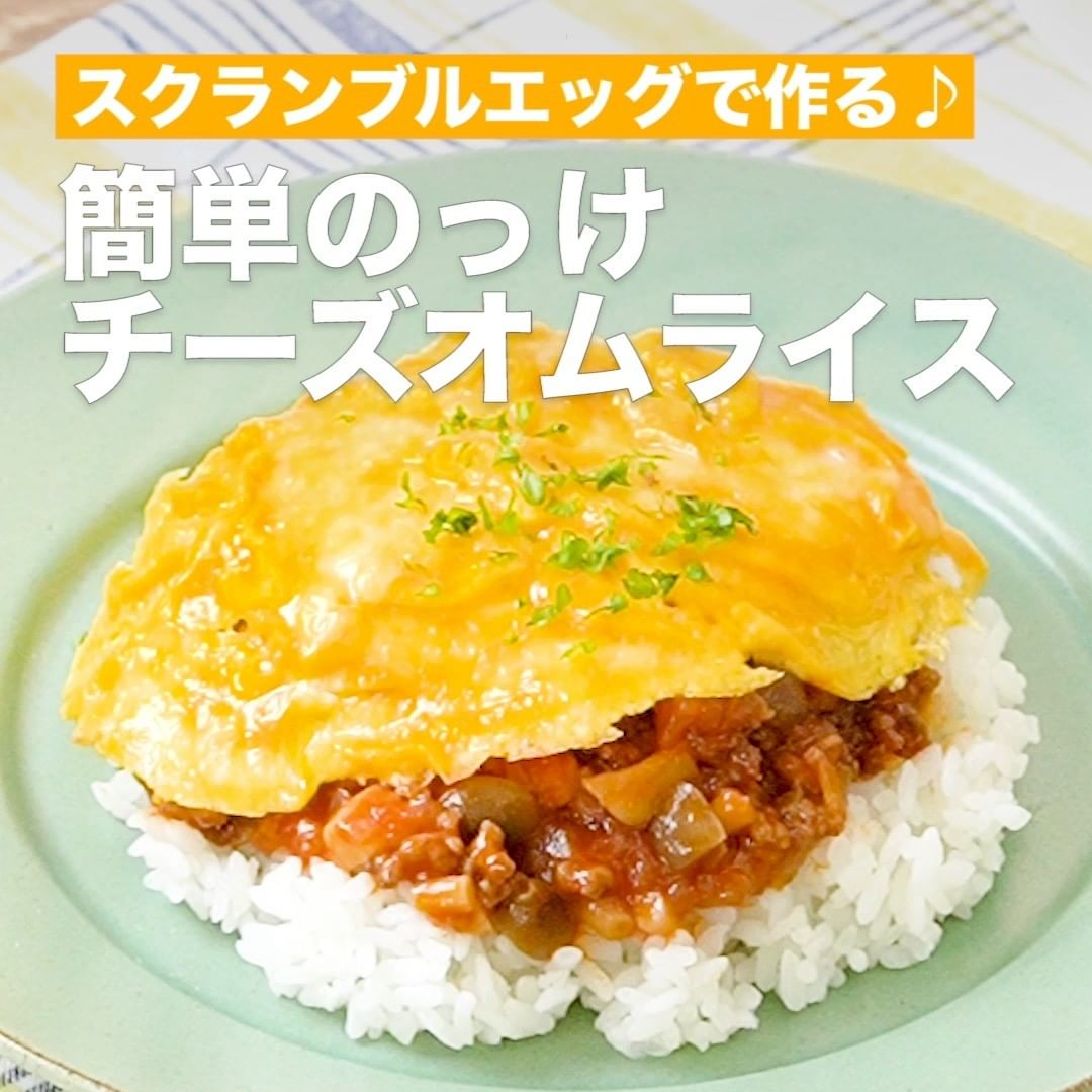 炒めるだけで包む手間いらずの簡単オムライスです♪ミートソースをごはんにのせるだけなので、ケチャップライスを炒める必要もなく、見た目もおしゃれな仕上がりになります。スクランブルエッグにすることでトロトロの半熟に仕上がります。卵にチーズを加えてコクを足しましょう!