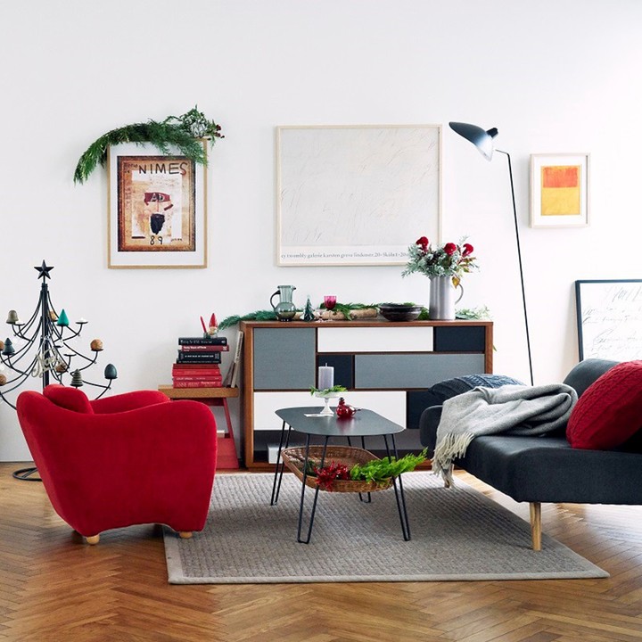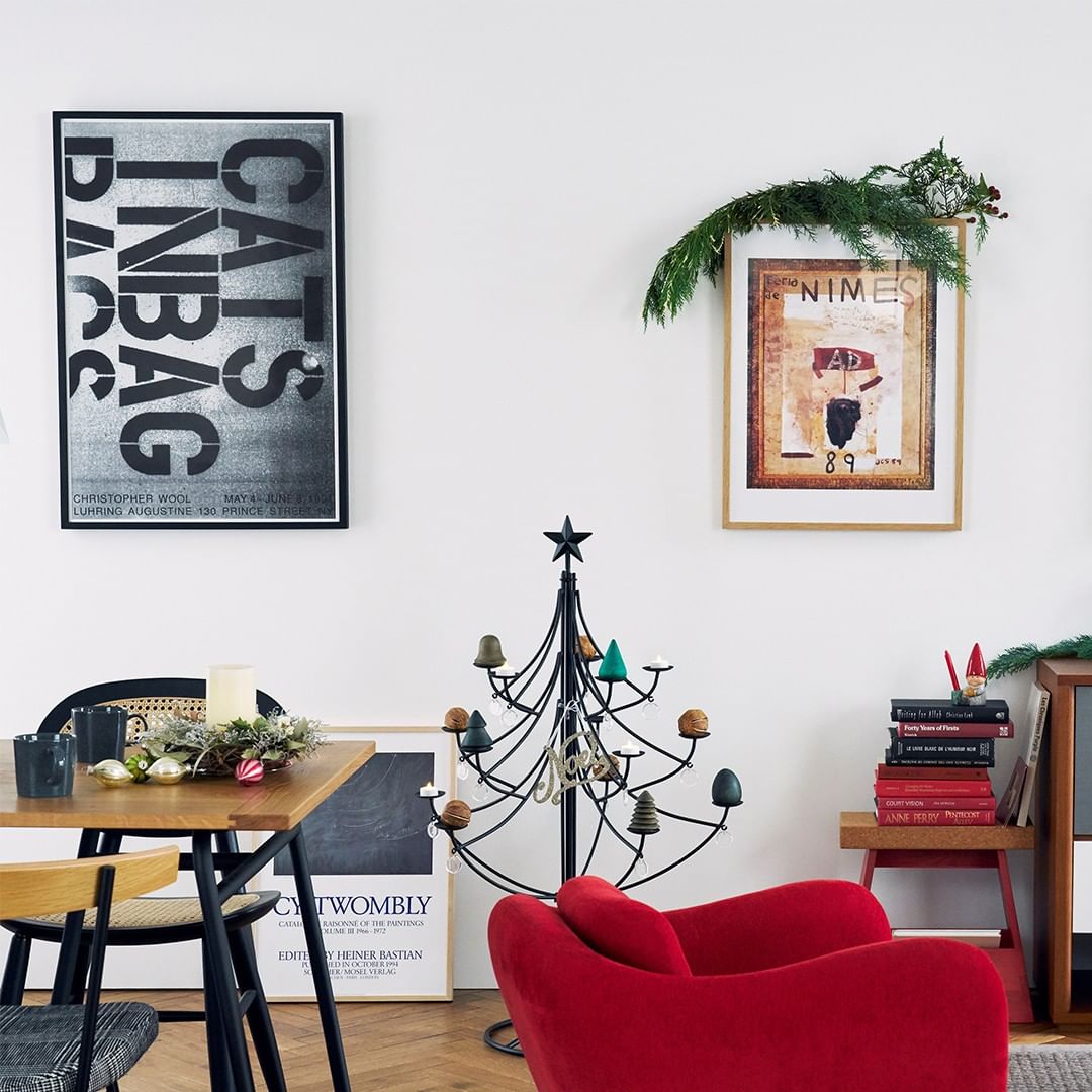 モノクロを基調としたインテリアに赤をプラス、ツリーもシックなものでしつらえて。