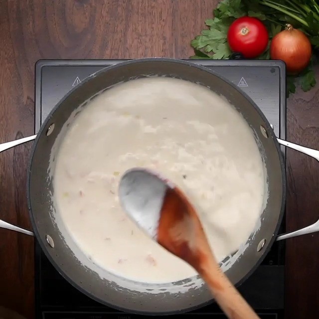 4. 生クリームを注ぎ、沸騰したら茹でたフェットチーネパスタを入れる。 エビとベーコンを鍋に戻し、パルメザンチーズとパセリを入れて混ぜる。チーズが溶けたら、完成!