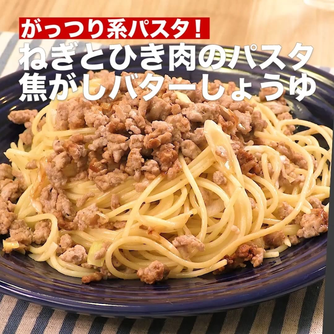 ④<がっつり系パスタ!ねぎとひき肉のパスタ 焦がしバターしょうゆ>