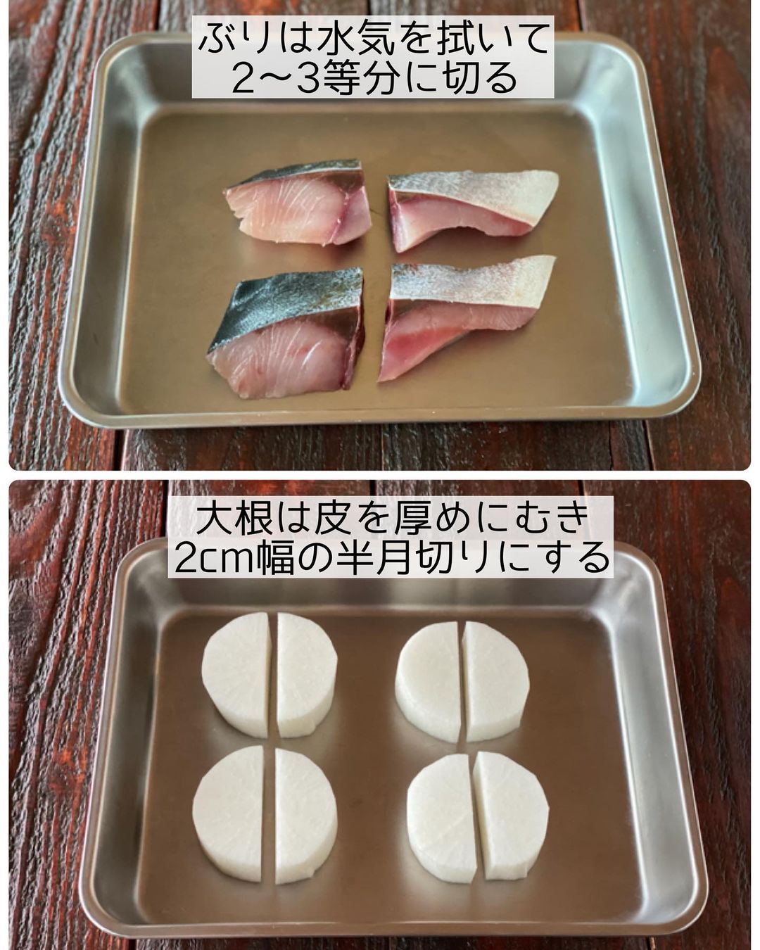 ➊ぶりはペーパータオルで余分な水気を拭き取り、𝟸〜𝟹等分に切る。大根は厚めに皮をむき(断面の外側から𝟸〜𝟹𝚖𝚖くらいのラインより内側に包丁を入れて厚くむく)、𝟸𝚌𝚖幅の半月切りにする。
