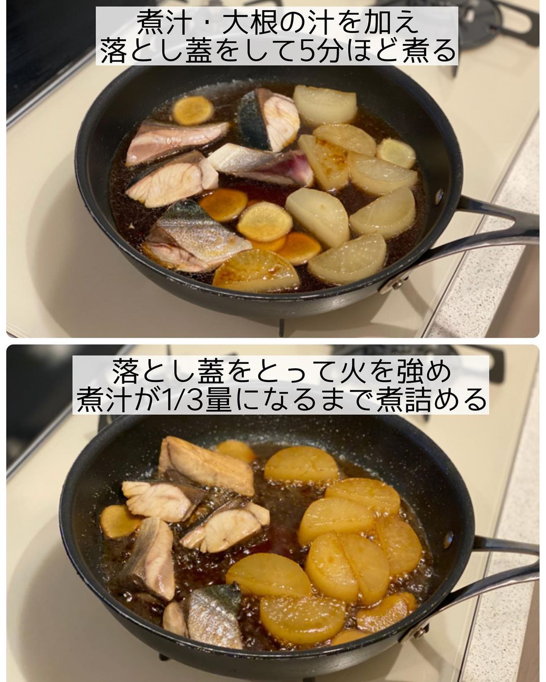 ➍〔𝙱〕・2の大根の汁を加えて落とし蓋をし、𝟻分ほど煮る。全体に火が通ったら落とし蓋をとって強火にし、煮汁が𝟷/𝟹量になるぐらい煮詰める。