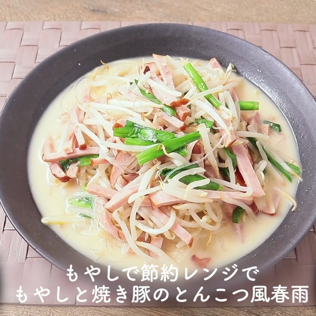 ⑤もやしで節約 レンジでもやしと焼き豚のとんこつ風春雨