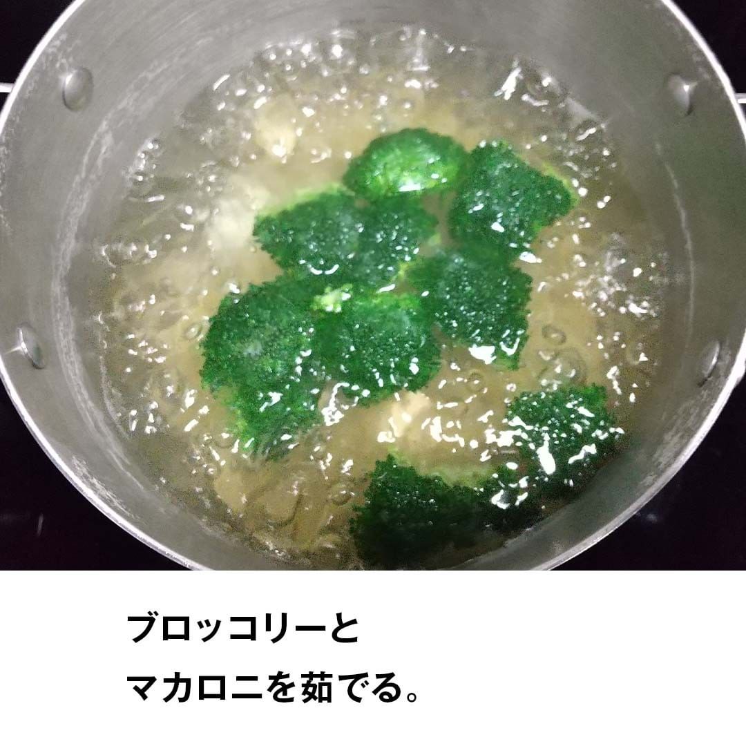マカロニは、塩を入れたお湯で表示時間通りに茹で、ブロッコリーはマカロニが茹で上がる1分前に入れて、茹で上がったらザルに上げておく。