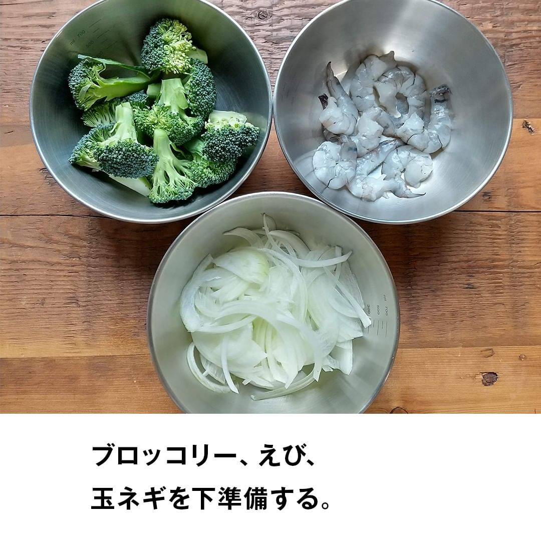 1. えびは殻をむき背ワタを取っておく。ブロッコリーは一口大の小房に、玉ネギは薄くスライスしておく。