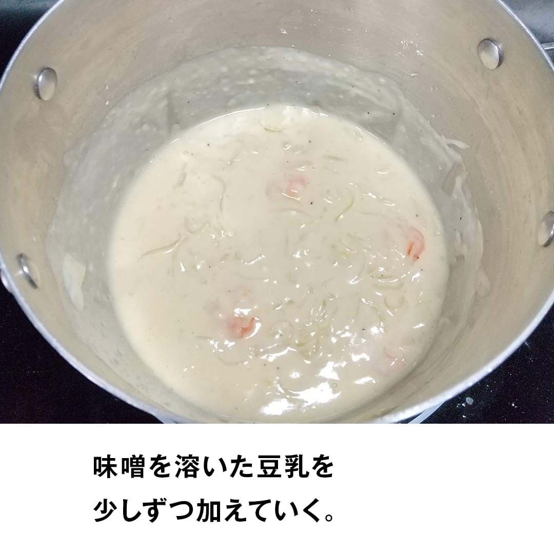 3. 味噌を溶いた豆乳を2.に少しづつ混ぜながら加えていく。