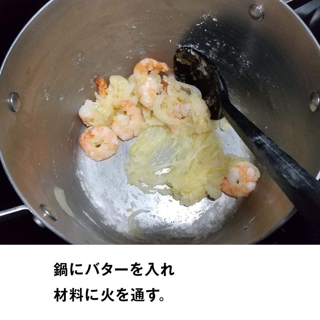2. 鍋にバターを入れて玉ネギに火が通ったら、えびを加えて弱火にし小麦粉を加えて粉っぽさがなくなるまで混ぜ合わせる。