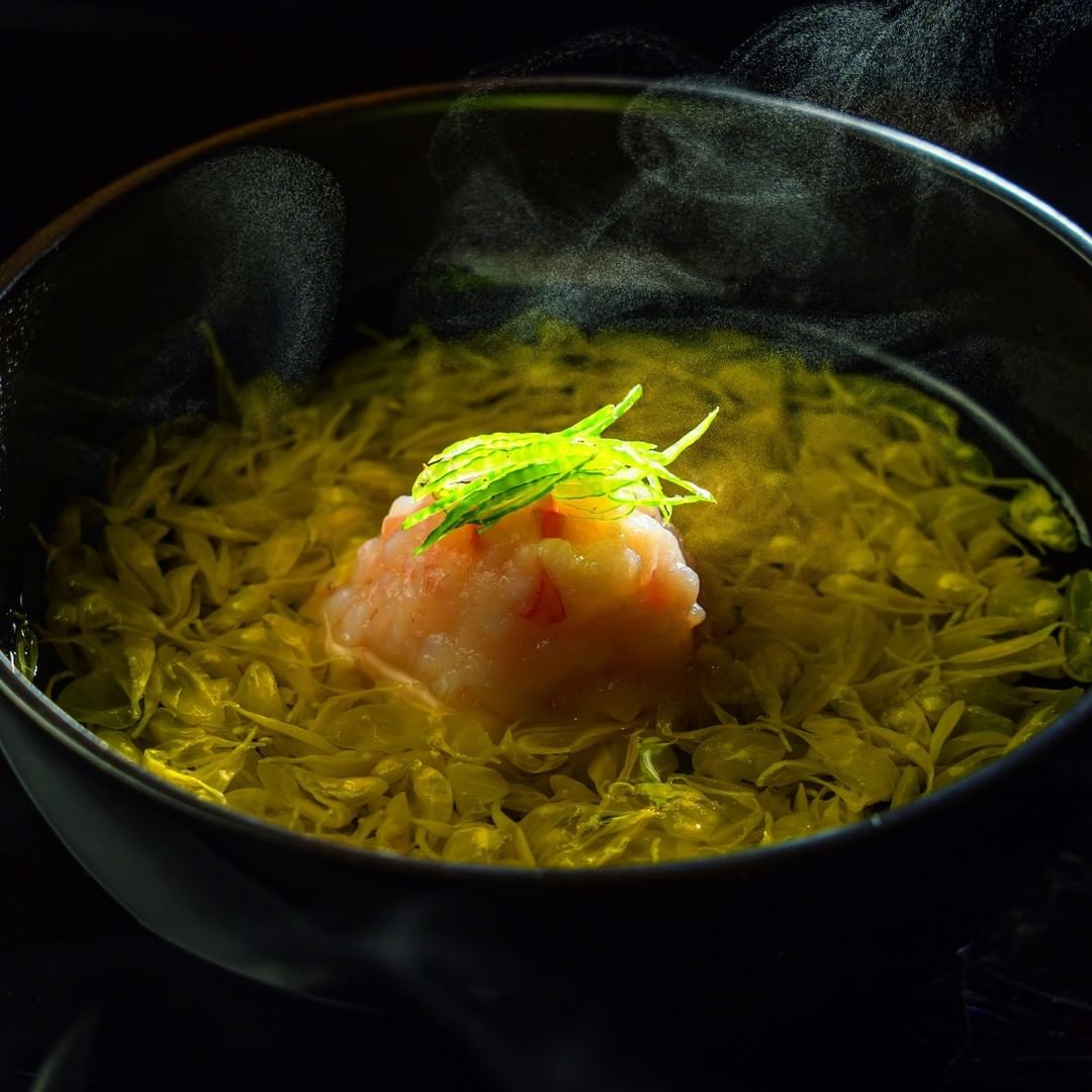 利尻昆布とマグロ節で丁寧に取った出汁に、この日は海老しんじょうと菊花を合わせて華やかに