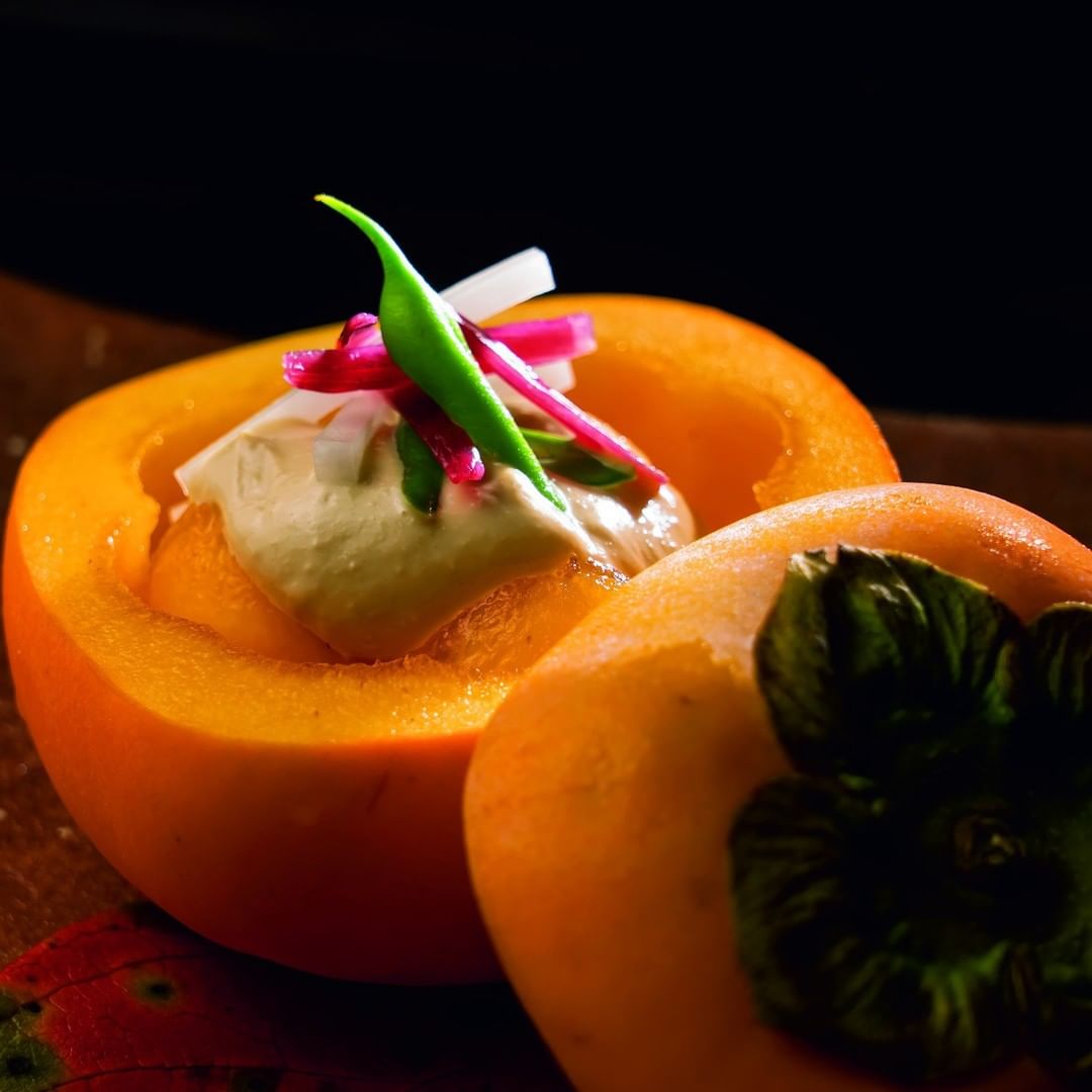 胡麻和えにした平柿の果肉を詰め、大根やミョウガ、インゲンをあしらって。