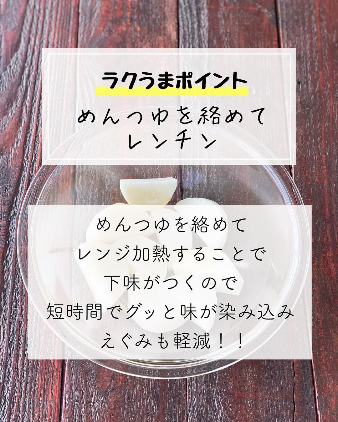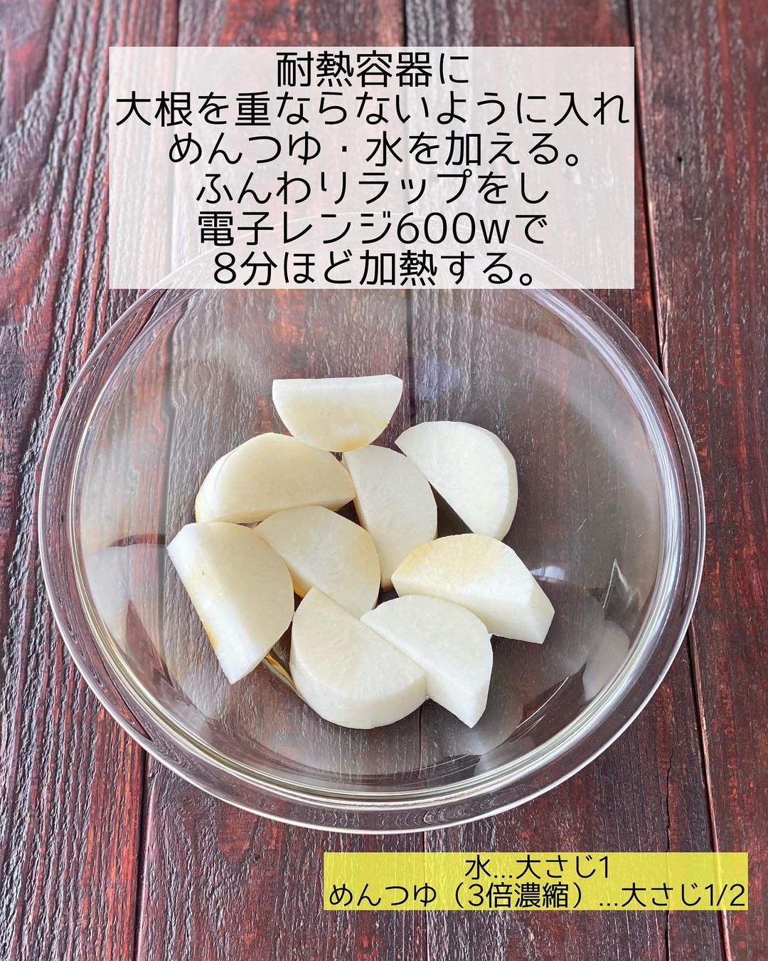 ➋耐熱容器に大根を重ならないように入れ、〔𝙰〕を加える。ふんわりラップをし、電子レンジ𝟼𝟶𝟶𝚠で𝟾分ほど加熱する。