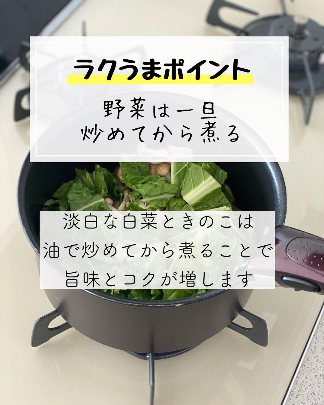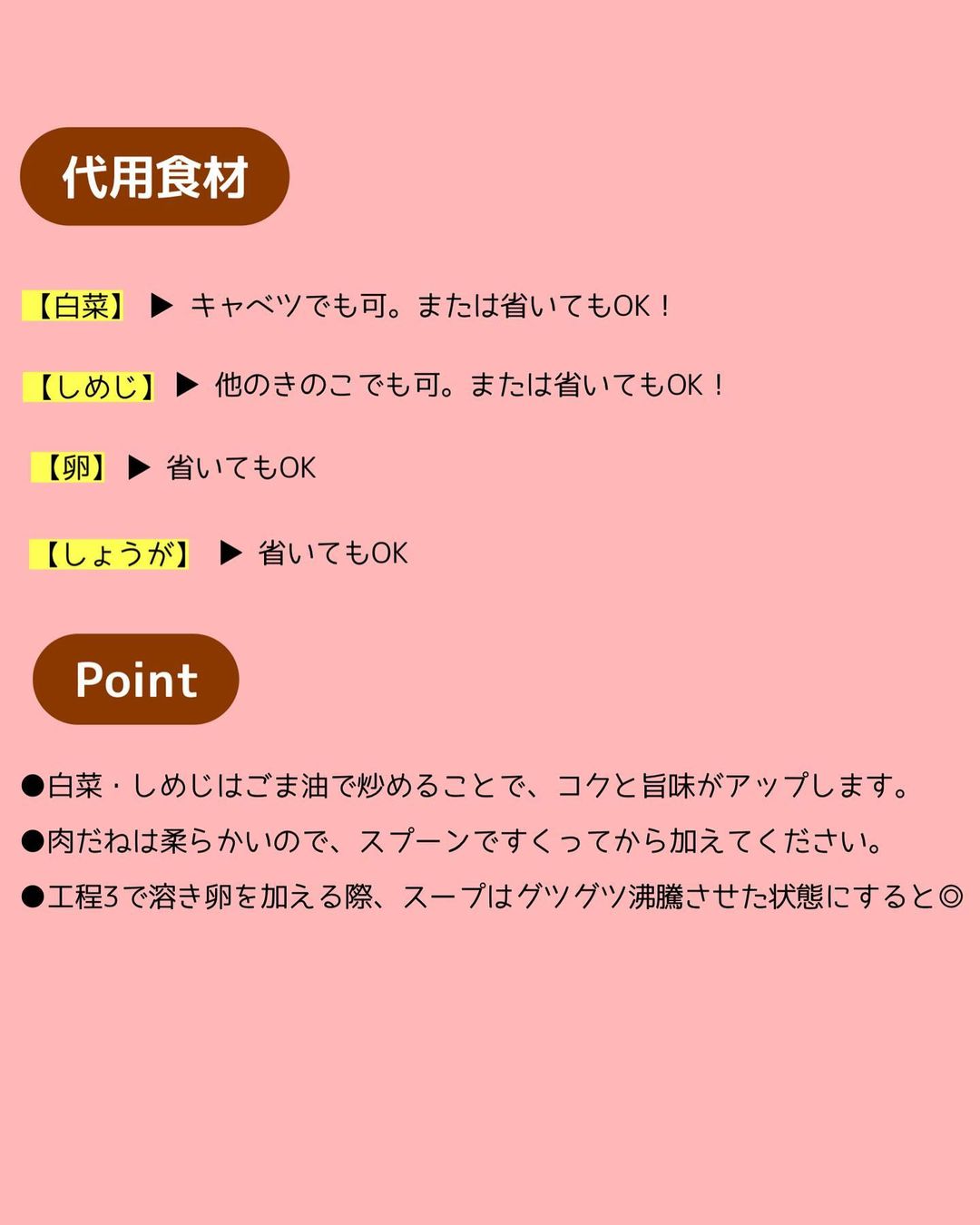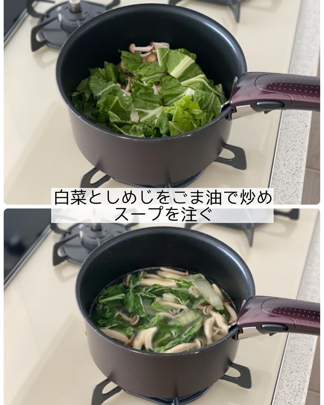 ➋鍋にごま油を中火で熱し、白菜・しめじを炒める。野菜がしんなりしたら〔𝙱〕を加え、1の肉だねをスプーンですくって落とし入れて𝟸〜𝟹分煮る。