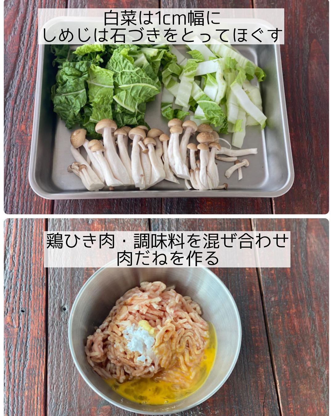 ➊白菜は𝟷𝚌𝚖幅に切る。しめじは石づきをとってほぐす。ボウルに鶏ひき肉・〔𝙰〕を入れて混ぜ合わせる。