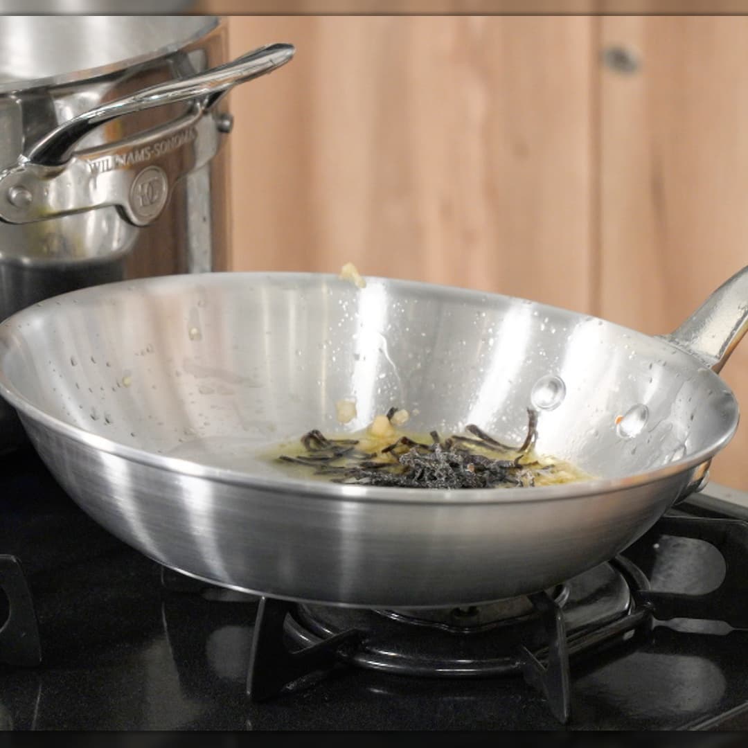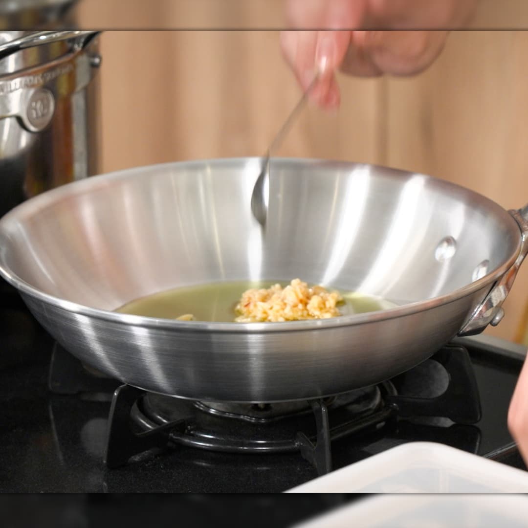 ②ニンニクにこんがり色がついたら塩昆布(ひとつまみ)を入れる