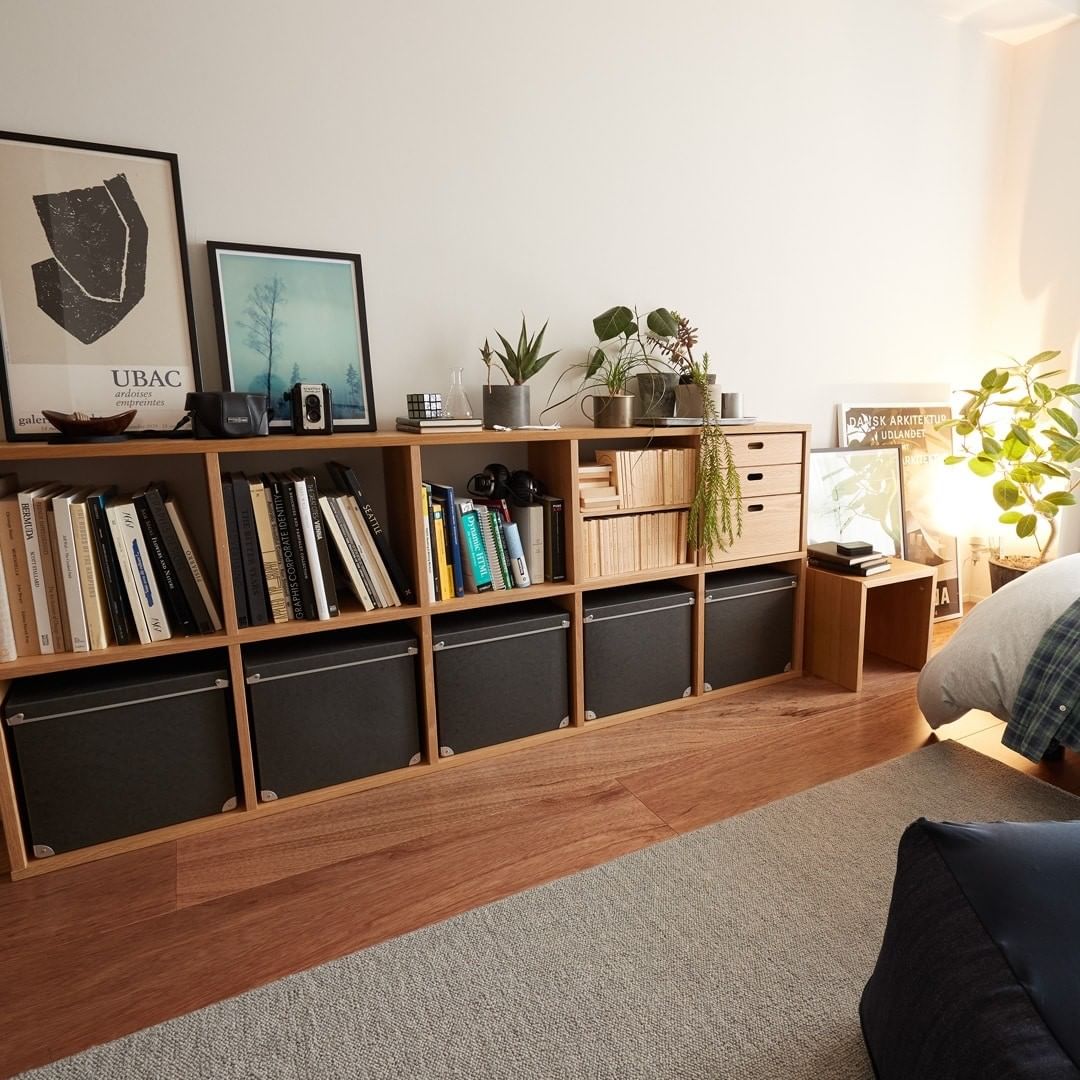 オーク材、ウォールナット材の2種類が揃うスタッキングシェルフは、木の持つ素材のあたたかみで、くらしの空間を小気味よく仕切り、心地良く整えます。