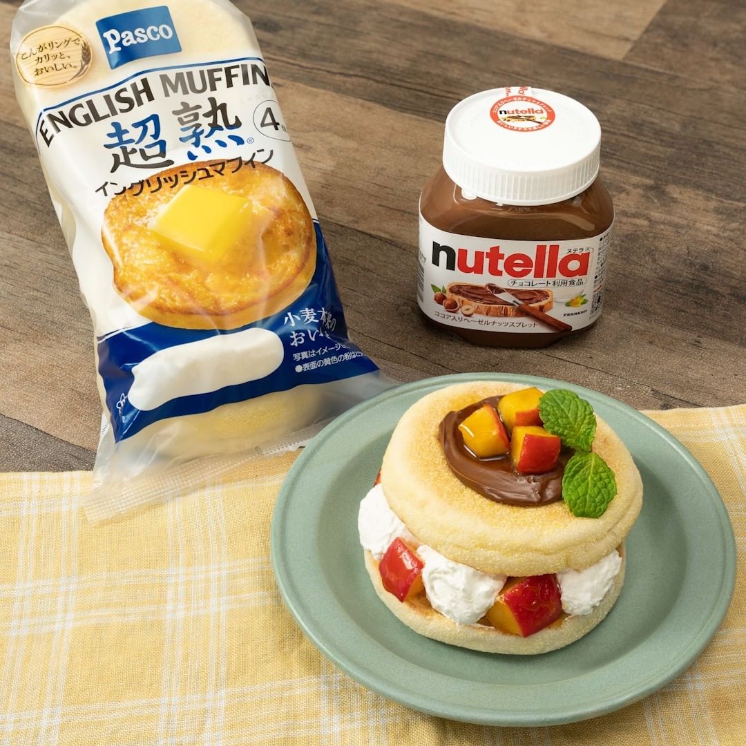 ヌテラと塩キャラメリゼりんごのイングリッシュマフィンサンドのご紹介です。塩キャラメリゼしたりんごの程よい甘じょっぱさに、「ヌテラ」の濃厚なヘーゼルナッツの香りが合わさり、やみつきになる一品です。トーストしたPasco「超熟イングリッシュマフィン」は、外はカリッと中はもっちり仕上がり、りんごの食感とも相性抜群ですよ。朝食やおやつにおすすめなので、この機会に試してみてくださいね。