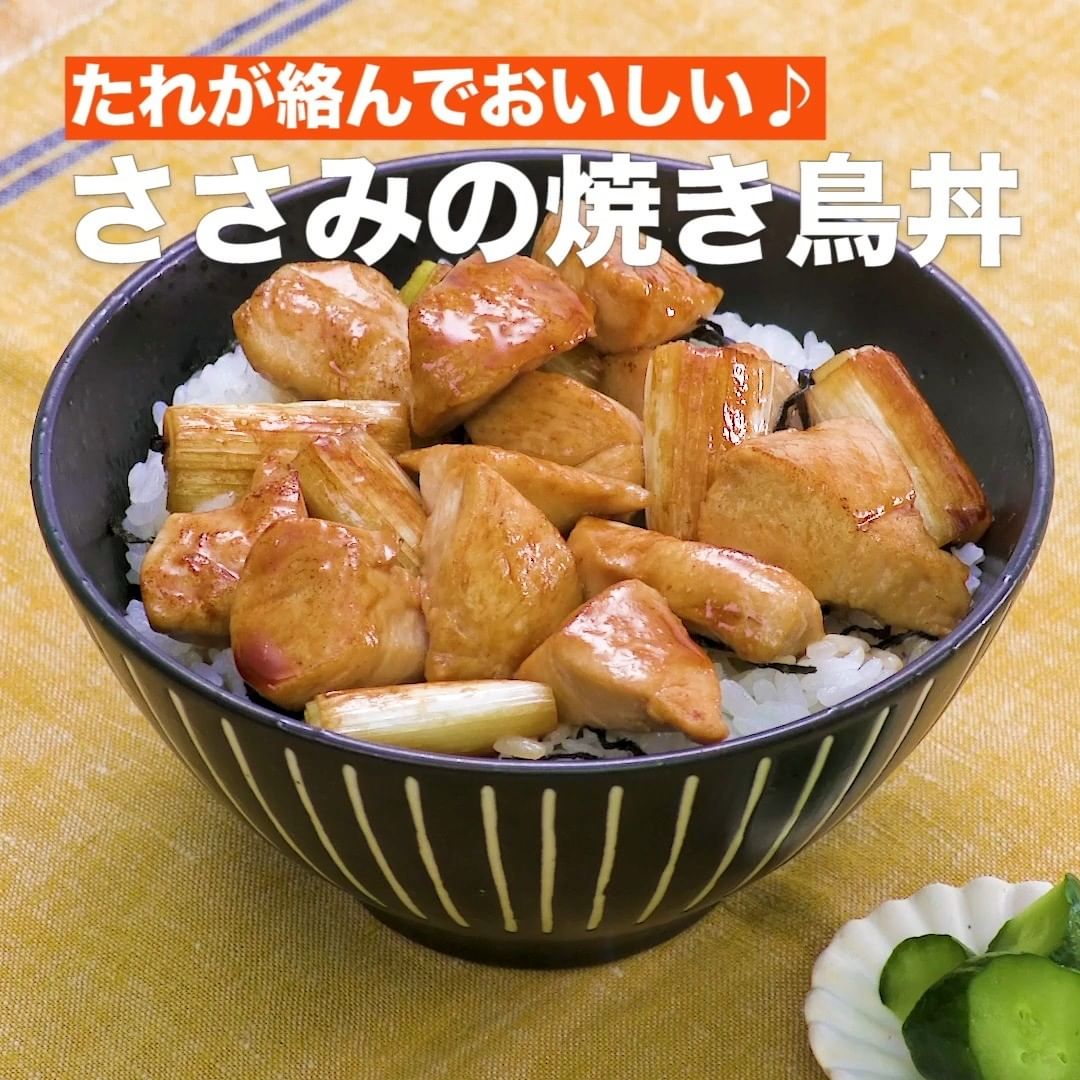 ささみを使って焼き鳥風の味付けにした簡単丼のご紹介です。甘辛いたれを煮詰めてとろとろになった味わいがごはんとの相性もバッチリ!ささみは火の通りも早く、さっと仕上がるのでぜひお試しください♪
