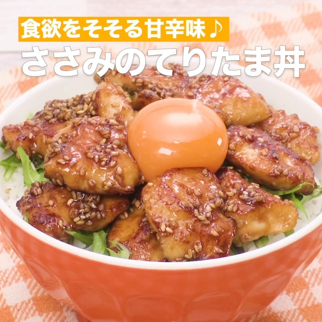 ⑤<食欲をそそる甘辛味♪ささみのてりたま丼>