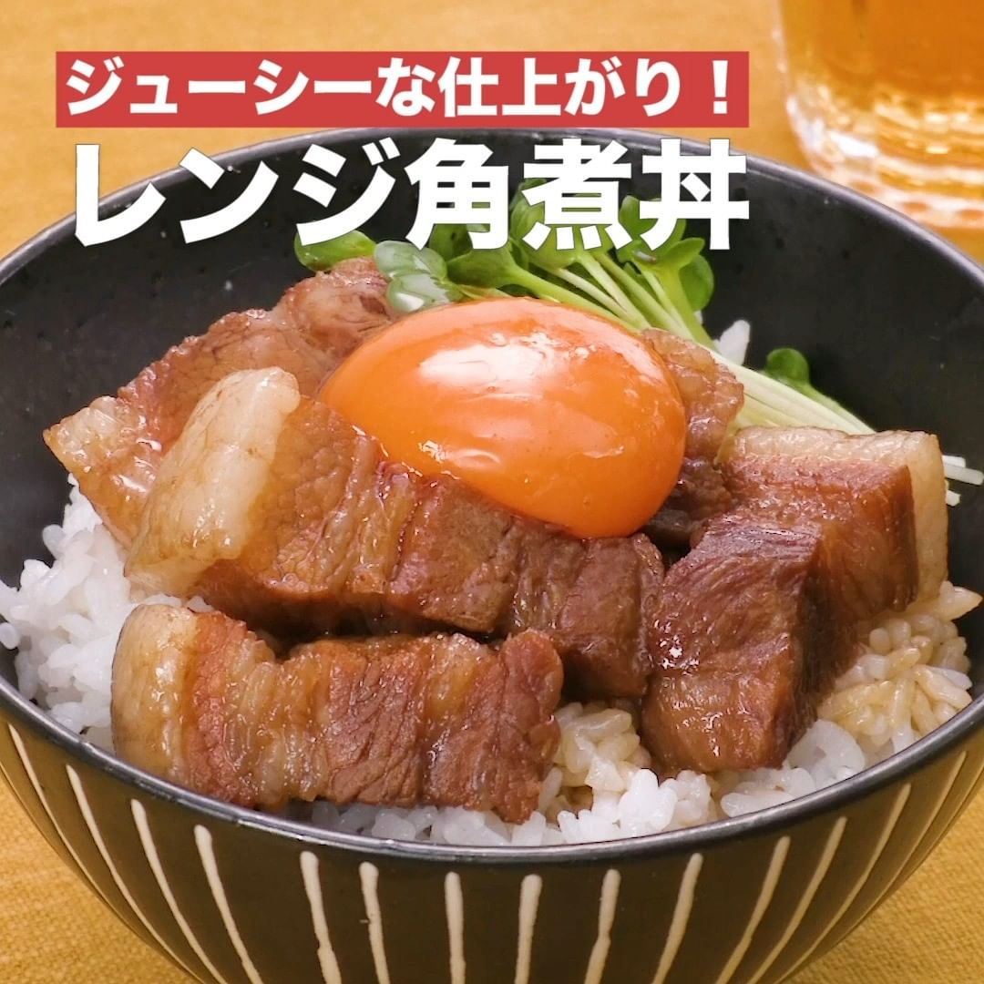 レンジで作れる簡単角煮丼のご紹介です♪豚肉はレンジ加熱した後に水で洗うことで臭みがとれておいしい!ラップをしたまま粗熱をとることで柔らかジューシーな仕上がりになります。夜ごはんやランチにおすすめな一品です!
