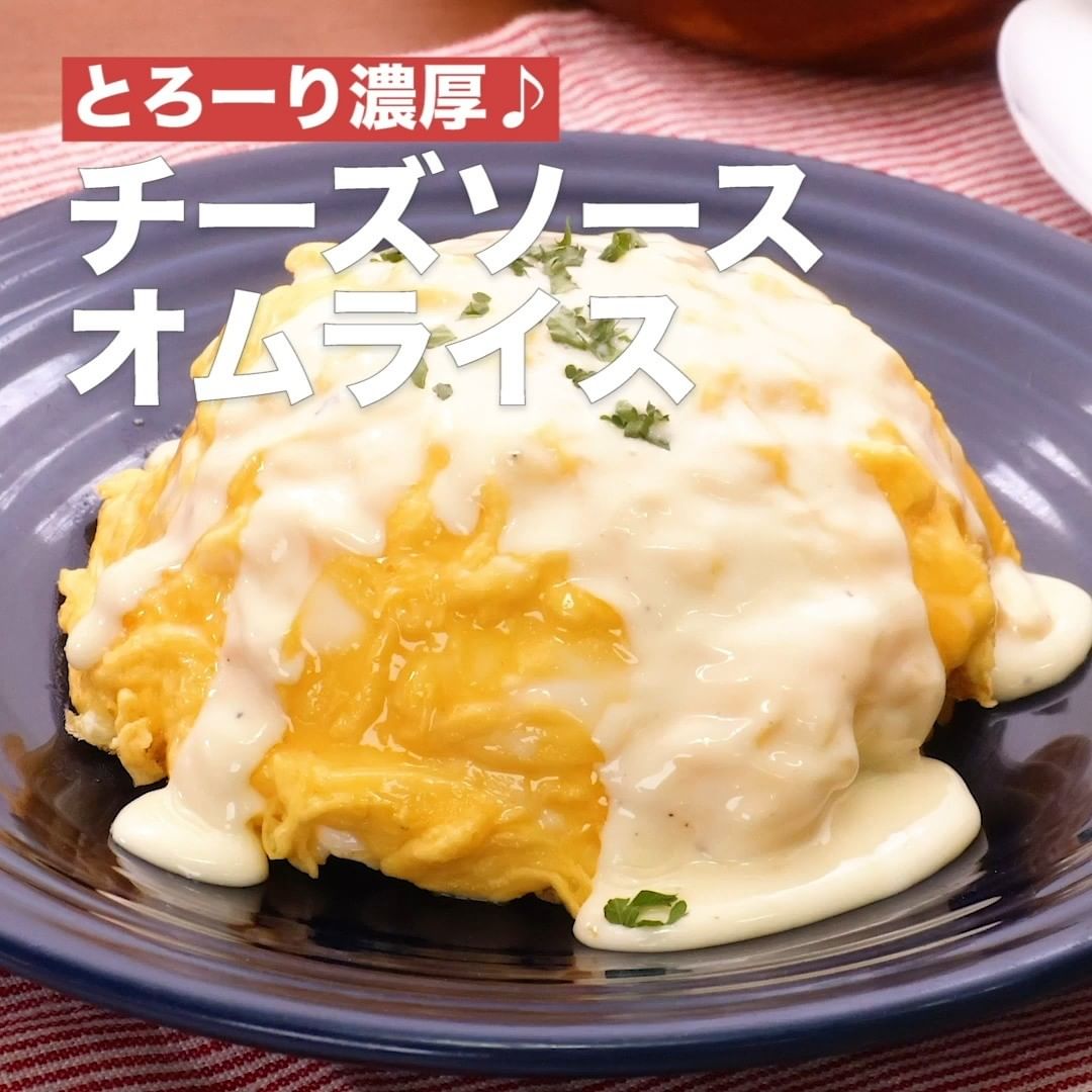 コクのあるチーズソースがポイントの、半熟オムライスです!ケチャップライスは電子レンジを使って作るので、時間がないときでも簡単♪トロッととろけるチーズにふわふわの卵がマッチして、幸せになれる一品です。