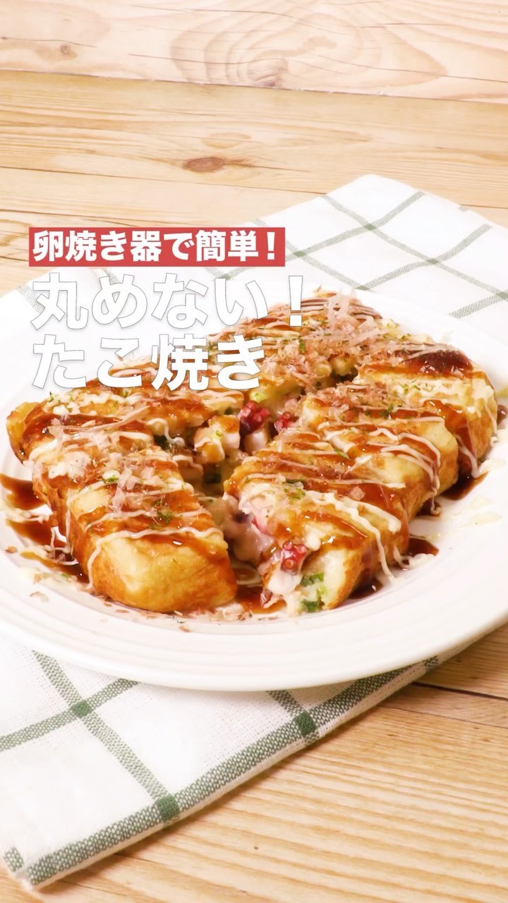 丸める手間なしであの美味しさに!卵焼き器いっぱいに広げて、たこ焼きの具材を焼きました!インパクト抜群の大きなたこ焼きぜひ作ってみてください♪