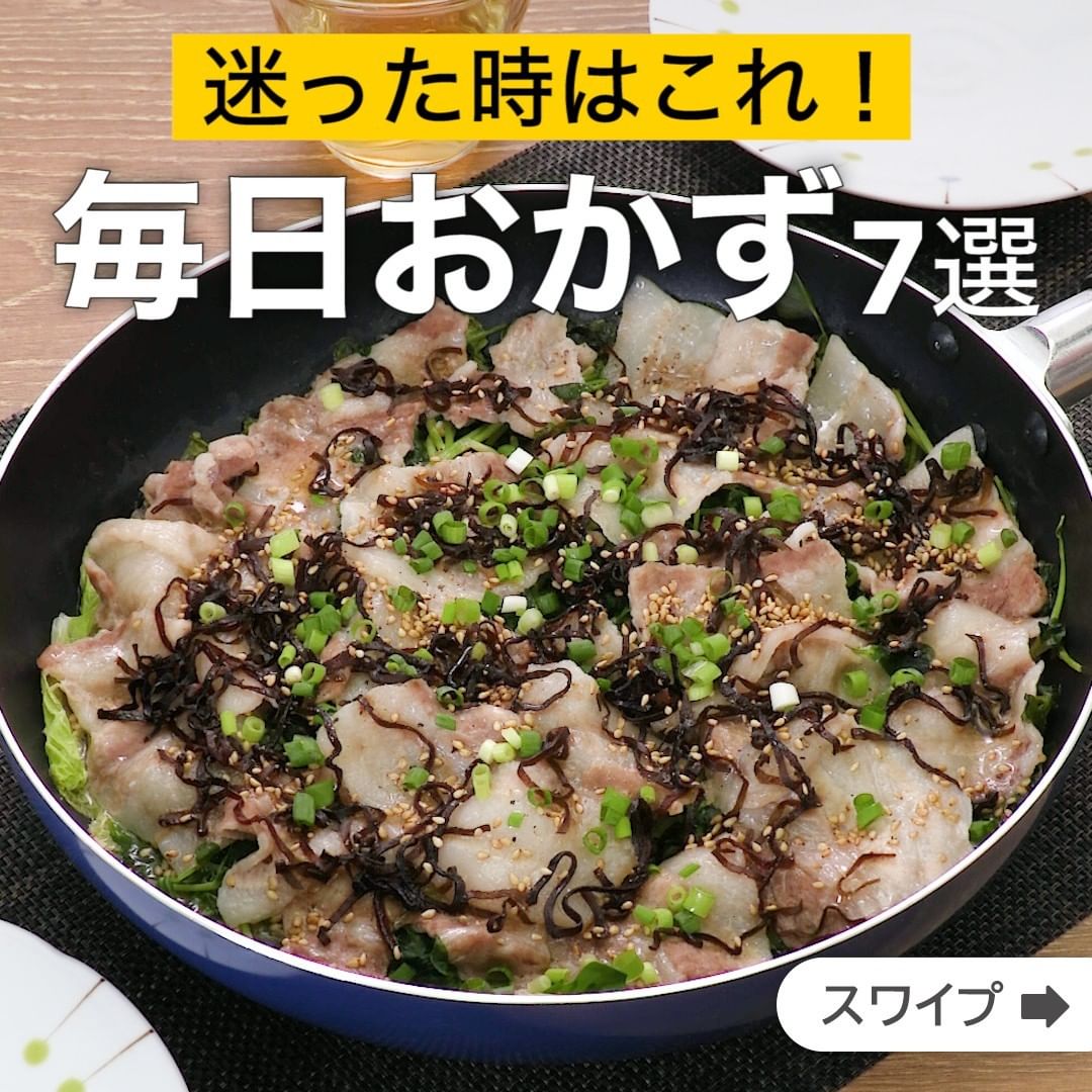 豚バラ肉と豆苗、塩昆布をフライパンで蒸し煮にします。重ねて蒸し上げるだけなので、手順も簡単です♪塩昆布とお肉の旨味が野菜とよく合い、お箸がすすみます。お好みでポン酢をつけるのもおすすめです。