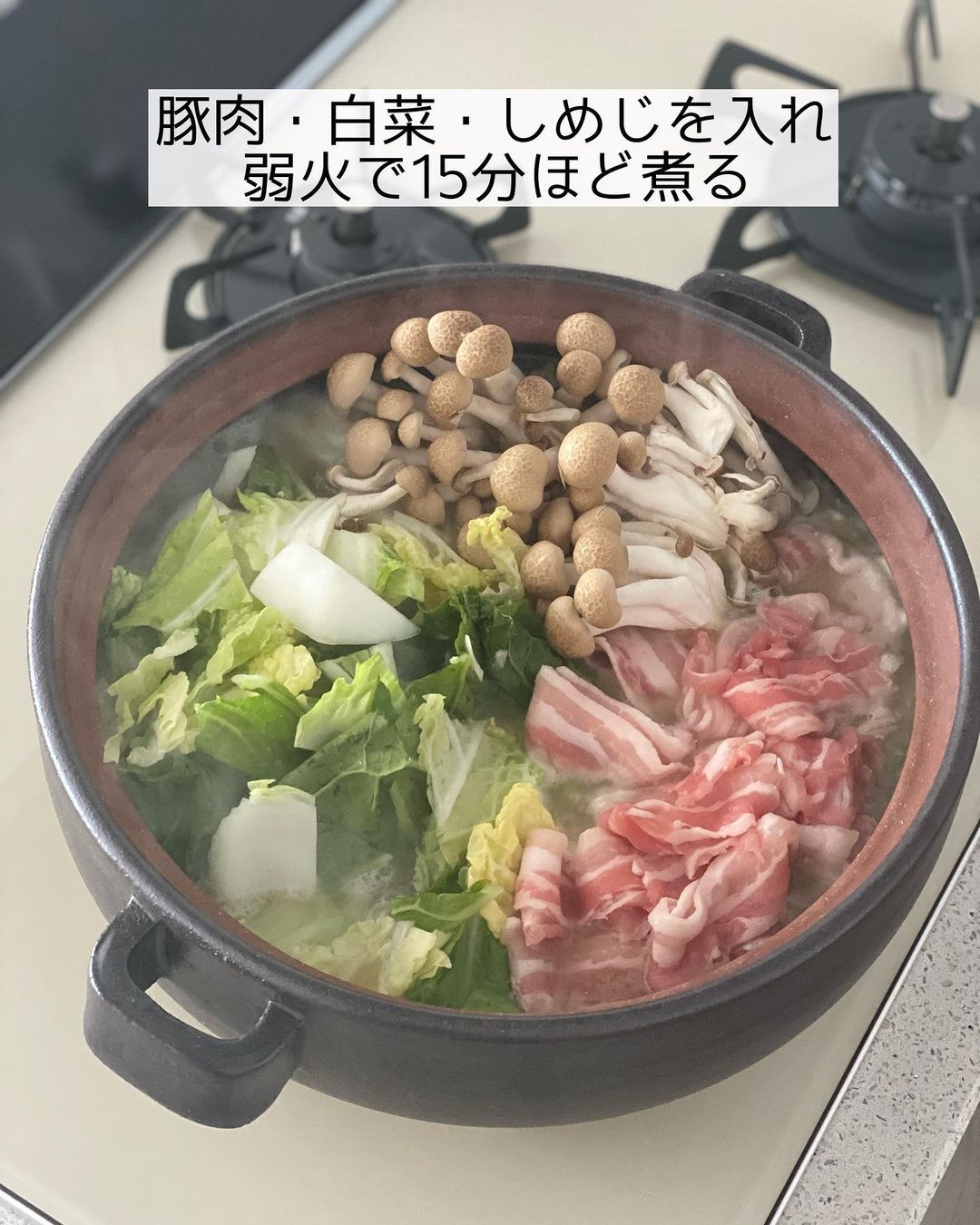 ➋鍋に〔𝙰〕・にんにくを入れて強火にかけ、沸騰したら豚肉・白菜・しめじを加える。弱火にし、全体に火が通るまで𝟷𝟻分ほど煮る。