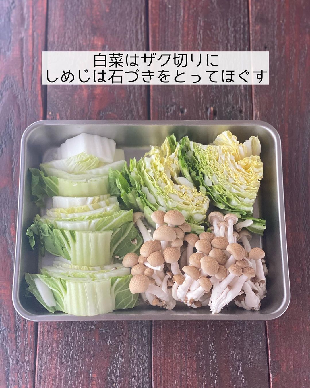 ➊白菜はザク切りに、しめじは石づきをとってほぐす。万能ネギ(お好みで)は、𝟺〜𝟻𝚌𝚖長さに切る。