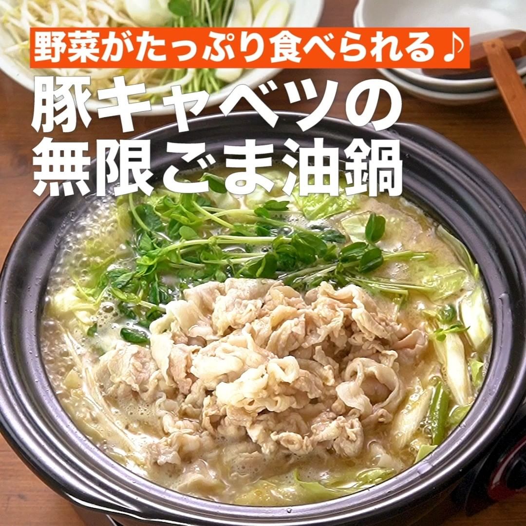 ①<野菜がたっぷり食べられる♪豚キャベツの無限ごま油鍋>