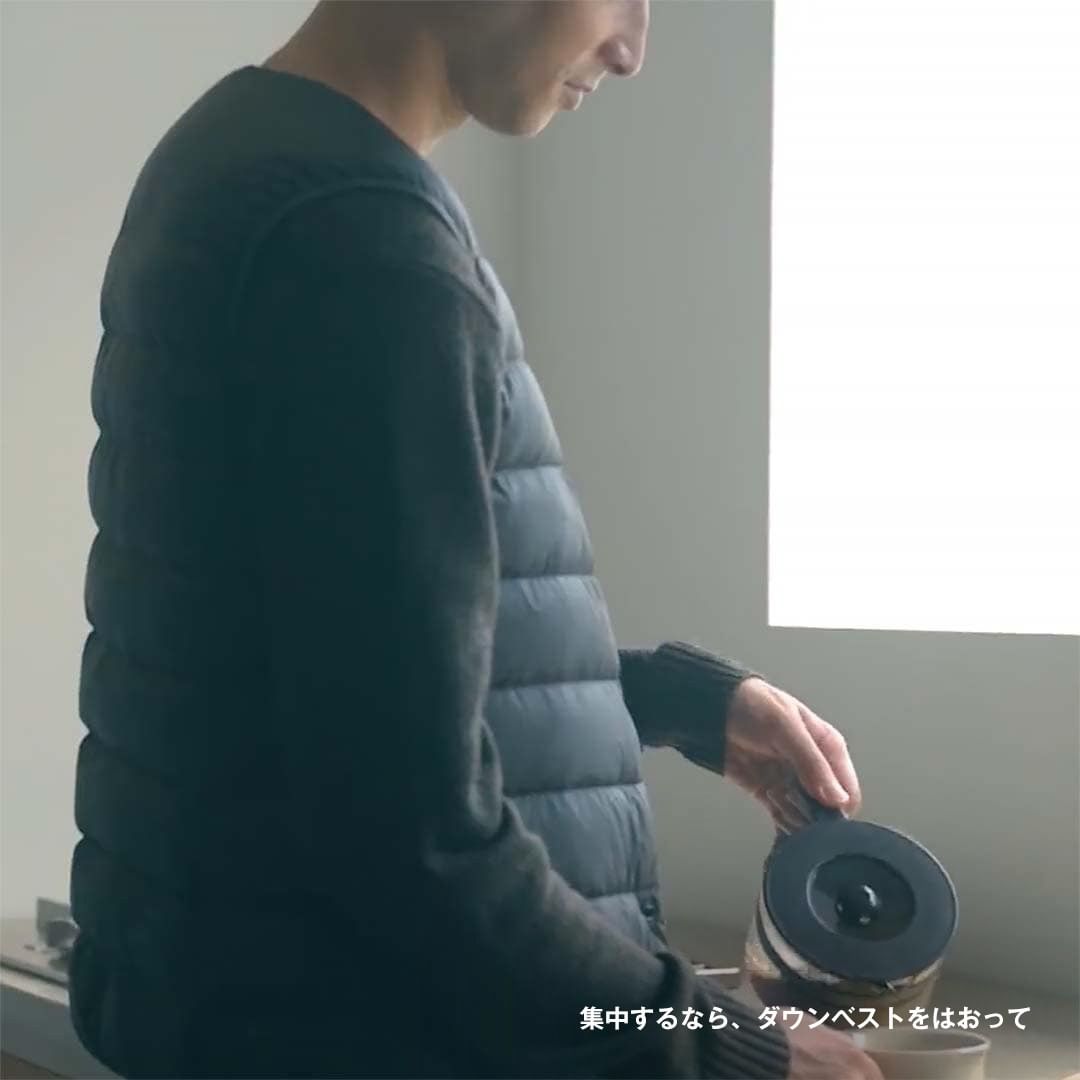 同じ姿勢を続けて、うっかり冷えてしまわないように、ふだんから、軽くてあたたかなダウンベストを羽織り、胴回りをあたたかい空気の層で守る習慣を。