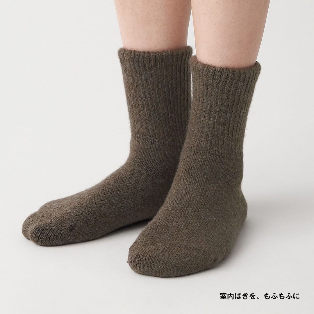 スリッパやルームシューズをはき続けにくい空間では、靴下のように身につけられる、ふわふわとしたルームソックスを。