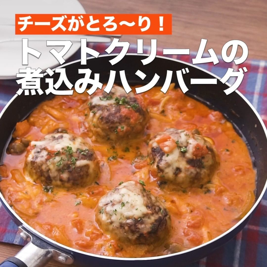 フランパンで作ったらそのまま食卓へ並べて熱々をご賞味ください♪チーズがとろけるトマトベースの煮込みハンバーグをご紹介します。牛乳とチーズのコクのおかげでトマトソースがまろやかに仕上がり、お箸が止まらないおいしさです。