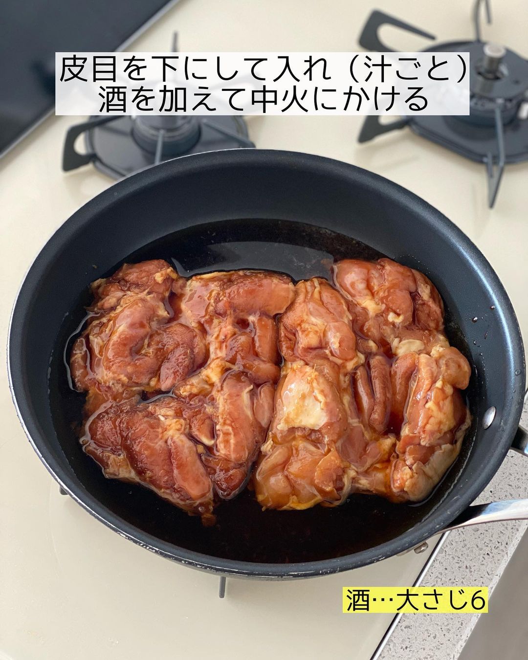 ➋フライパン に皮目を下にした1(汁ごと)・酒を加え中火にかける。沸騰したら落とし蓋をし、時々上下を返しながら𝟷𝟸分ほど煮る。