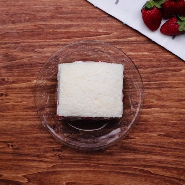 3. Place sliced strawberries on the bread and add whipped cream. Place another bread. Repeat until all 6 slices are layered.