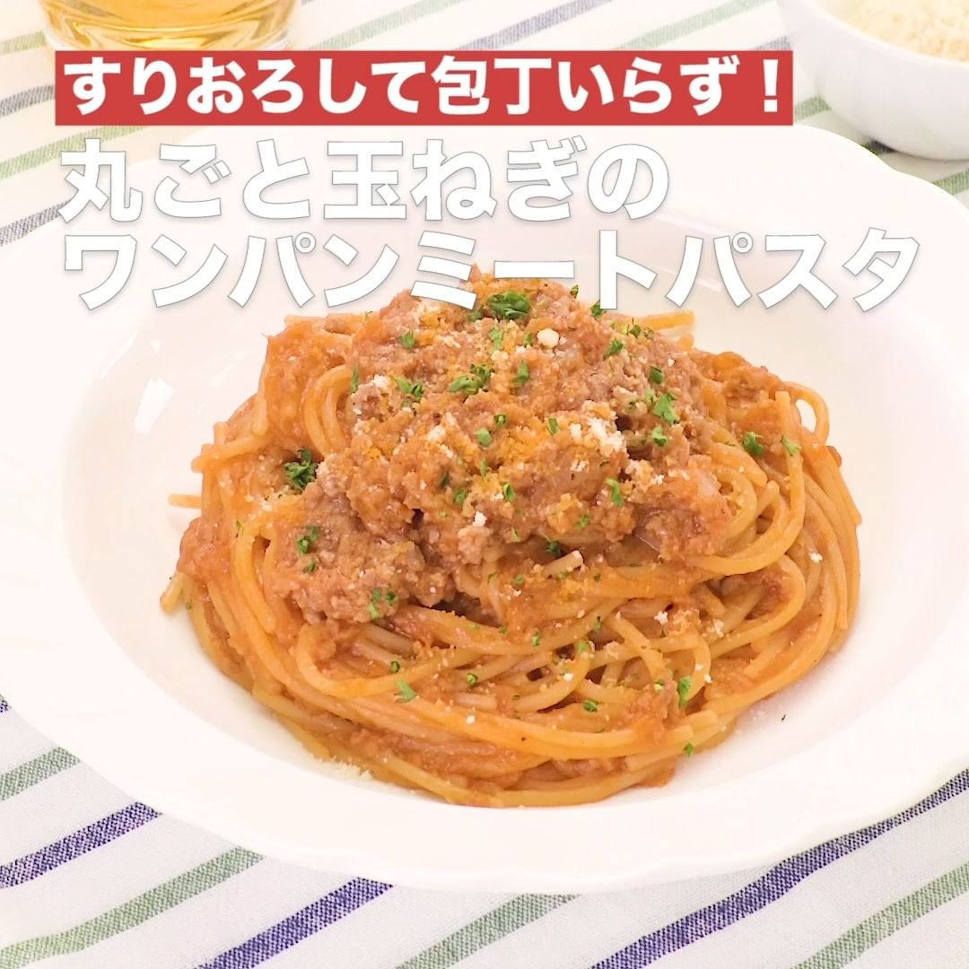 ⑤<すりおろして包丁いらず!丸ごと玉ねぎのワンパンミートパスタ>