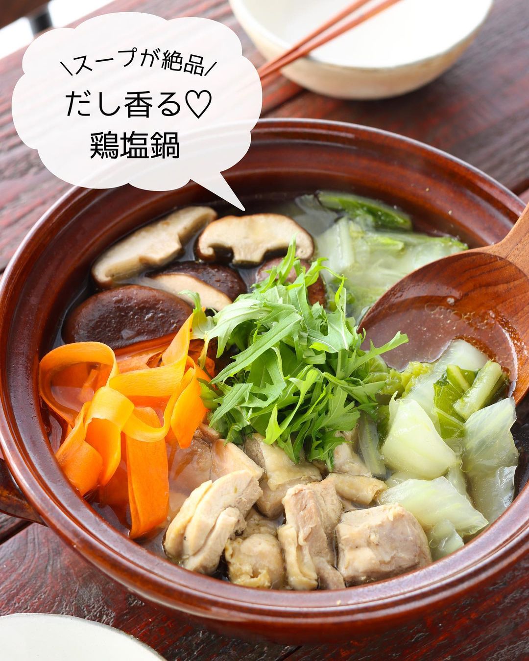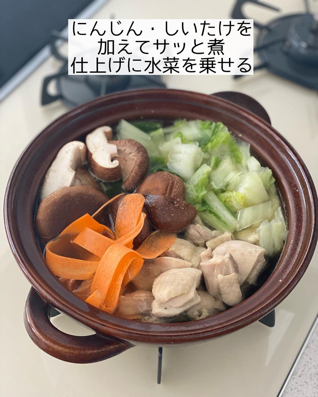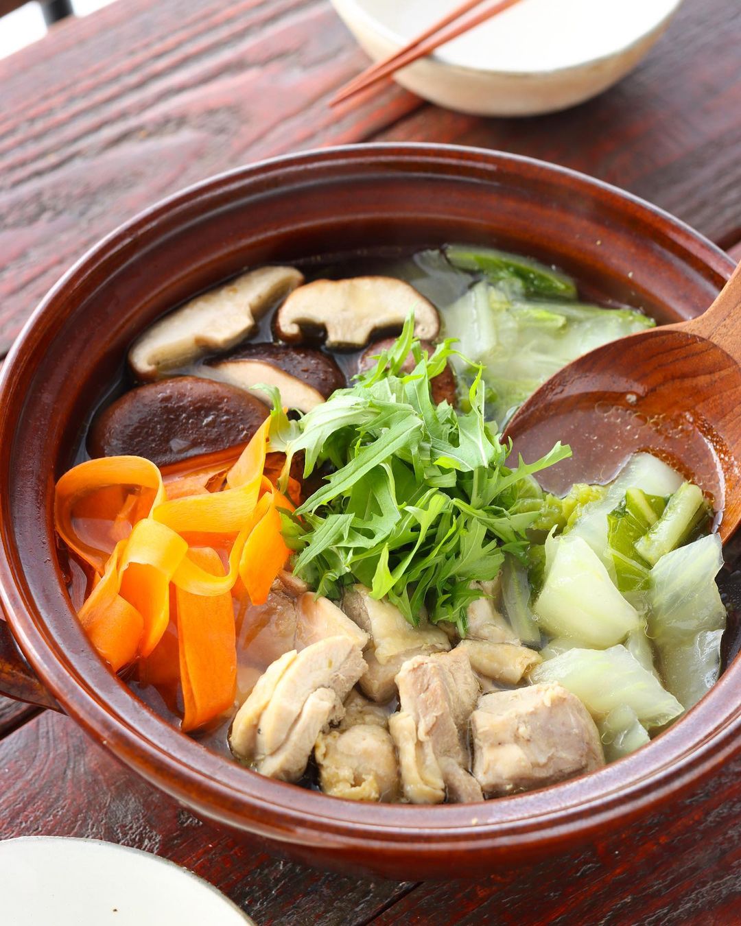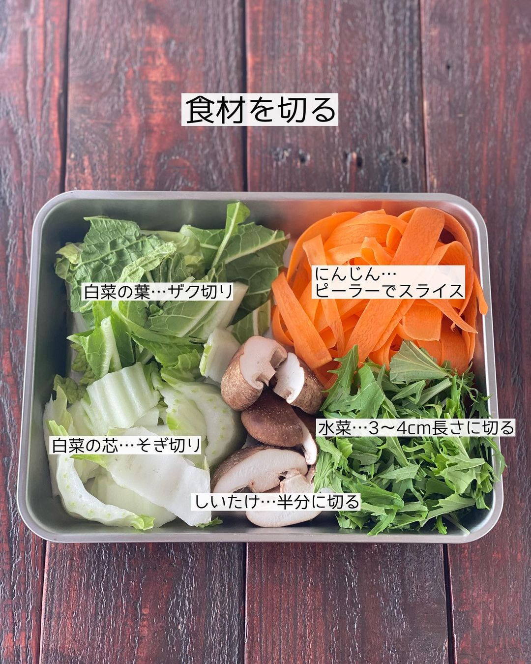 ➊鶏肉はひと口大に切る。白菜は葉と芯に分け、葉はザク切りに芯はそぎ切りにする。しいたけは半分に切る。にんじんはピーラーでスライスし、水菜は𝟹〜𝟺𝚌𝚖長さに切る。