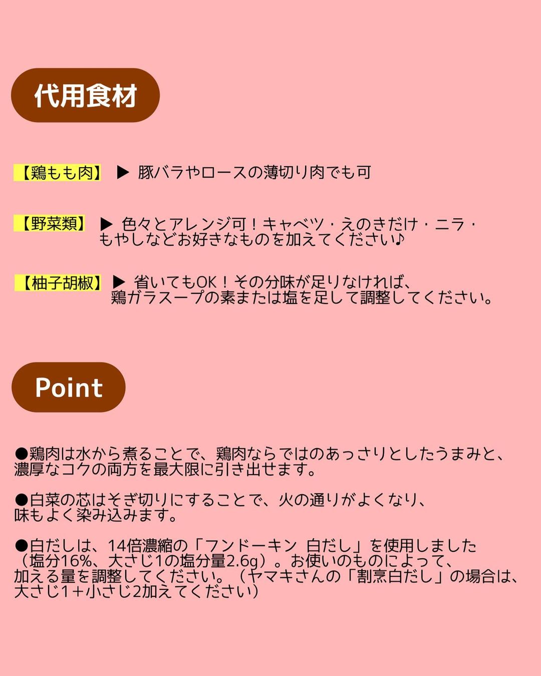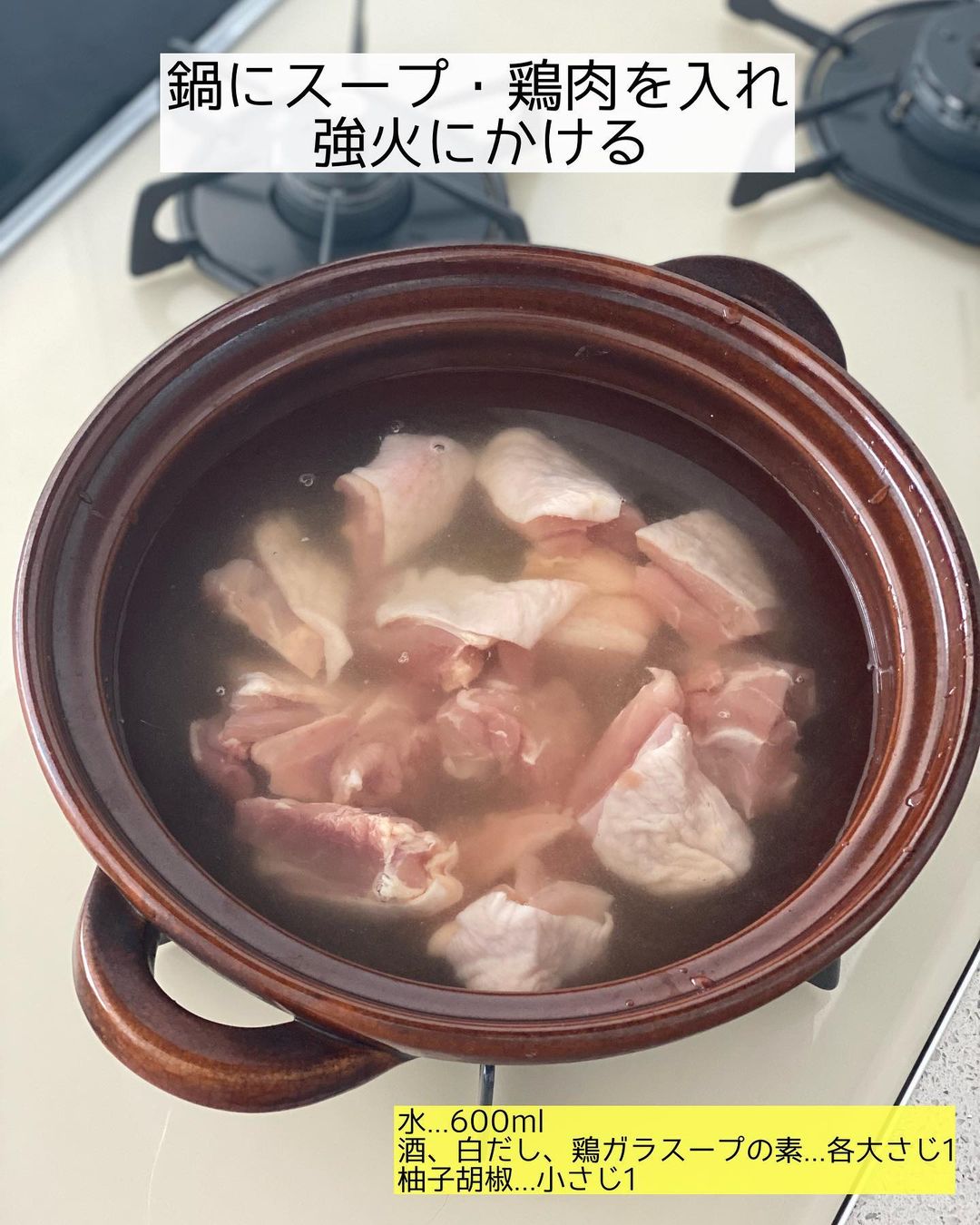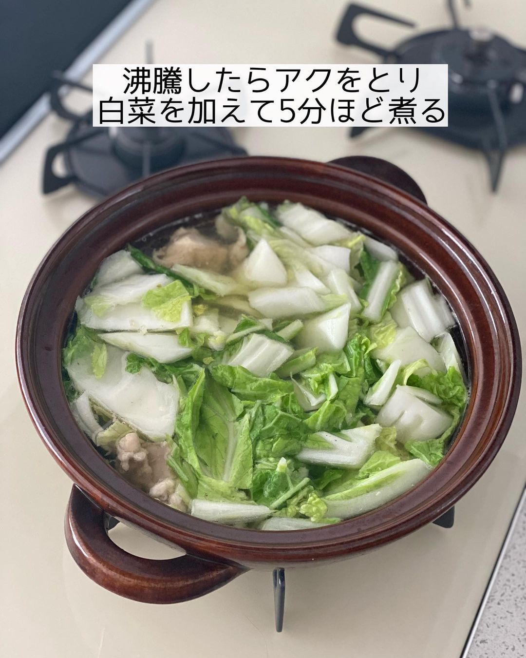 ➋鍋に鶏肉・〔𝙰〕を入れて強火にかける。沸騰したら中火にしてアクをとり、白菜を加えて𝟻分ほど煮る。