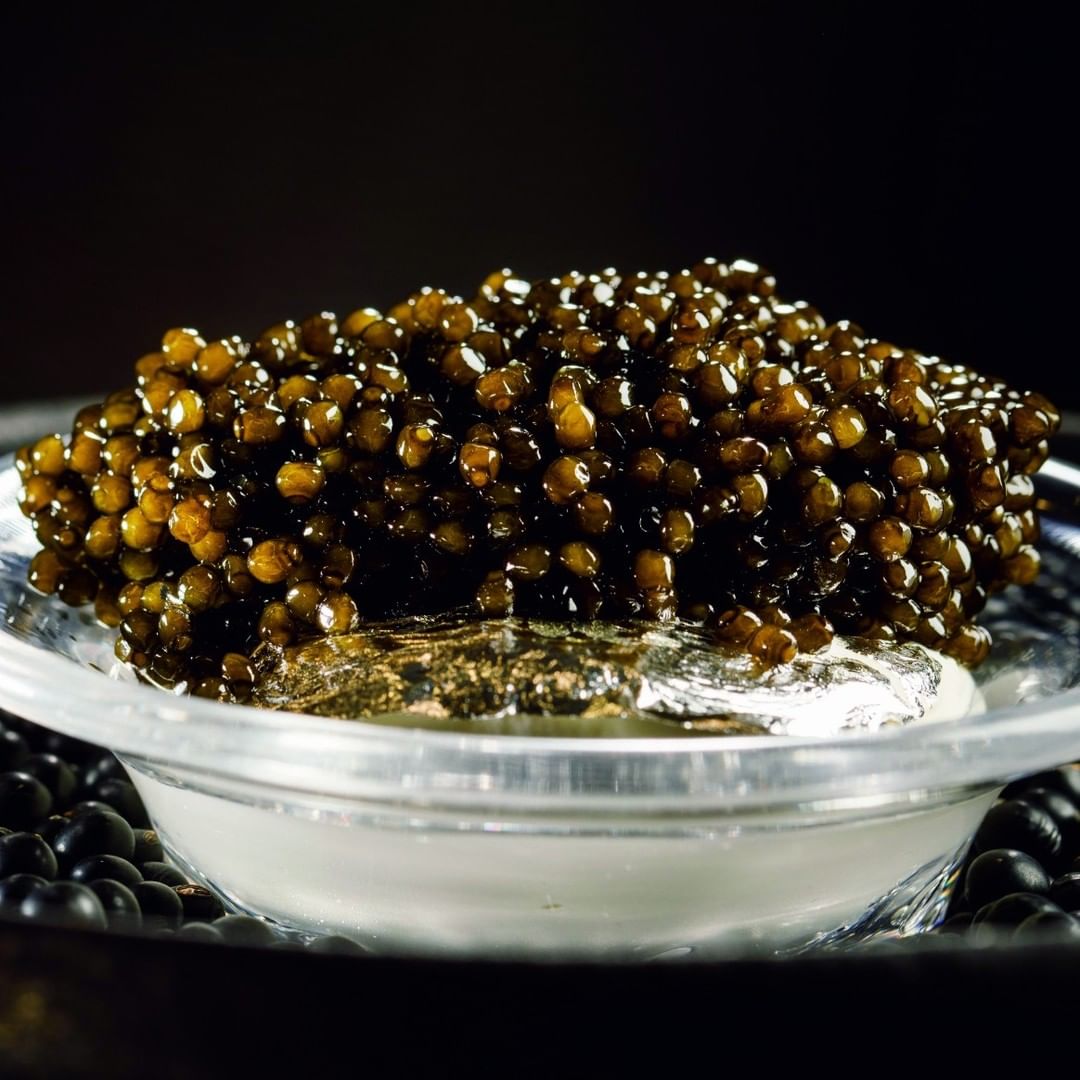 器の中にはジャージー牛の生クリームと銀箔、そこに輝くキャビアを惜しみなく