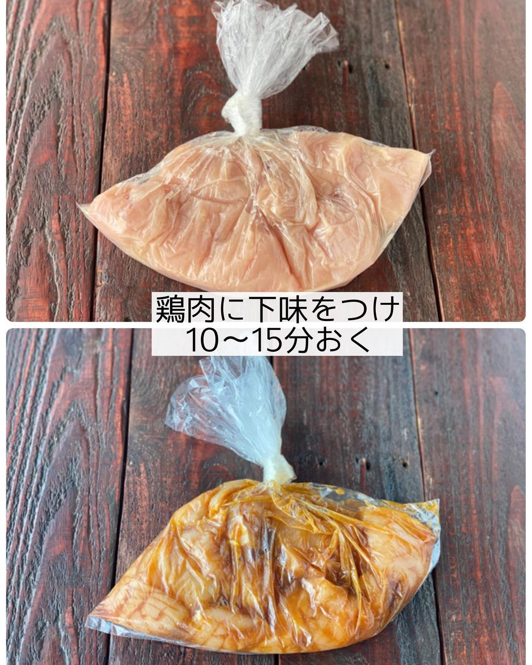 ➋ポリ袋に1・〔𝙰〕を入れてよく揉み込み、水分がなくなるまでよく揉み込む。〔𝙱〕を加えてさらに揉み込み、空気を抜いて口を閉じる。そのまま𝟷𝟶〜𝟷𝟻分おく。