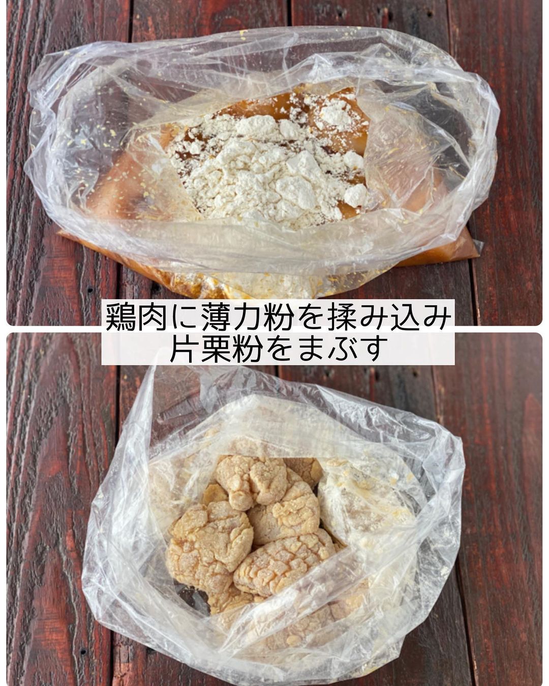 ➌2に薄力粉を加えて粉っぽさがなくなるまでよく揉み込み、新しいポリ袋に入れる。片栗粉を加えて口を閉じ、上下にふってまんべんなくまぶす。