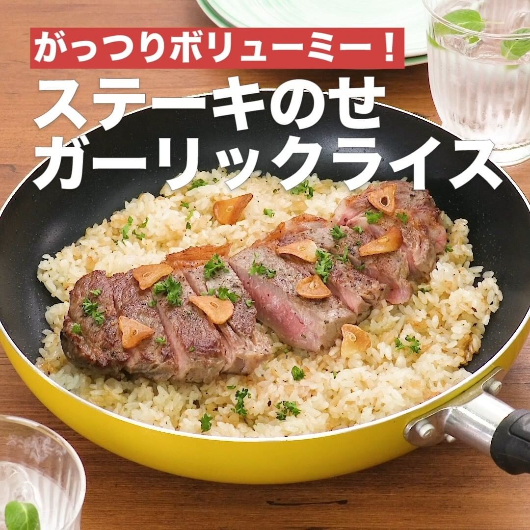 ①<がっつりボリューミー!ステーキのせガーリックライス>