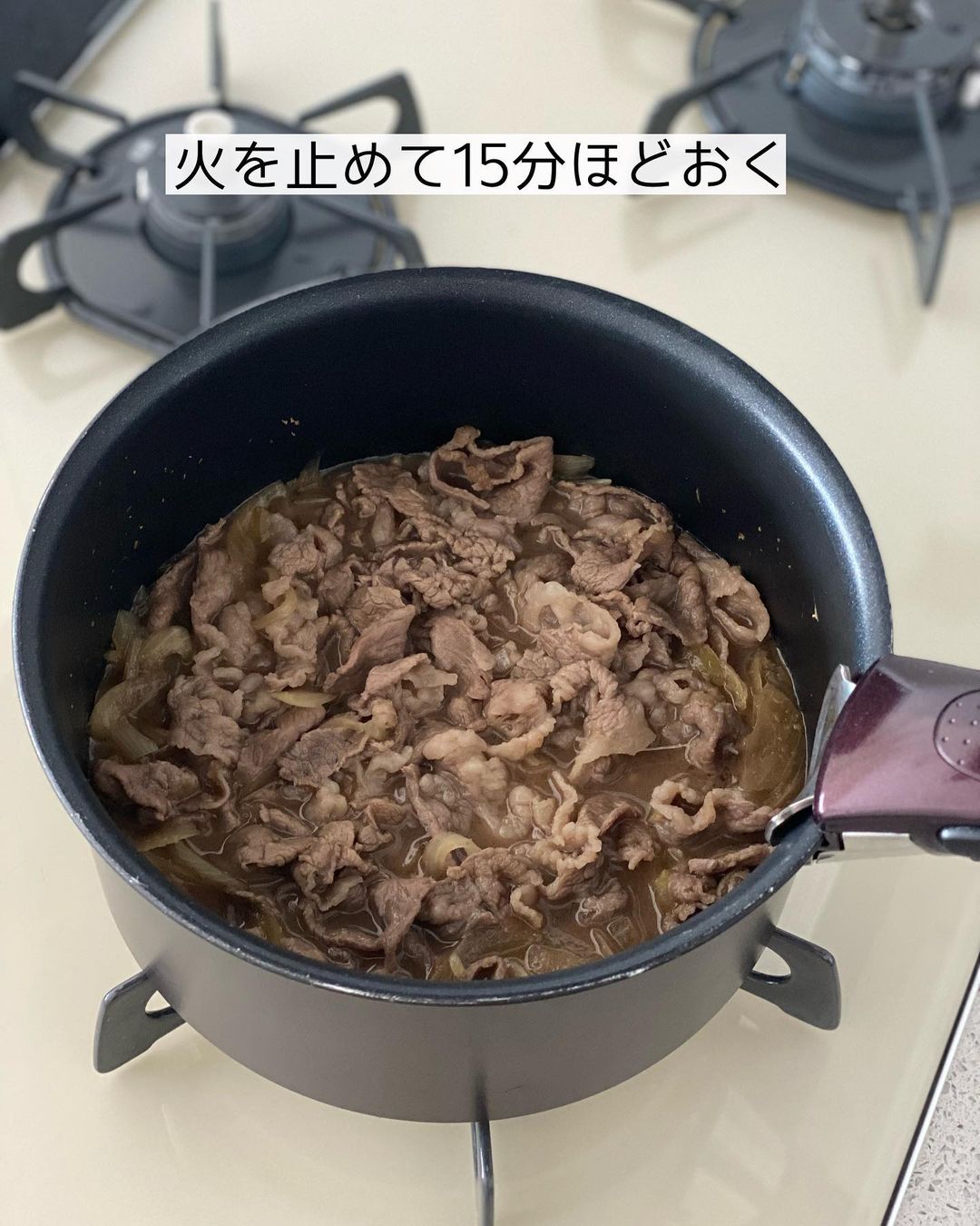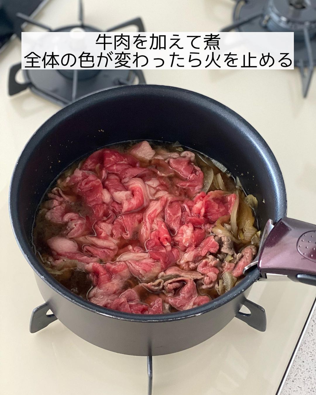 ➌牛肉を加えて煮、全体の色が変わったら火を止め、𝟷𝟻分ほどおく。