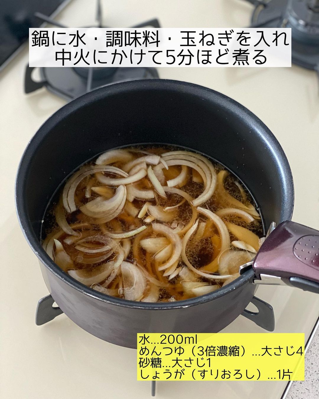 ➋鍋に〔𝙰〕・玉ねぎを入れて中火にかけ、沸騰したらそのまま𝟻分ほど煮る。