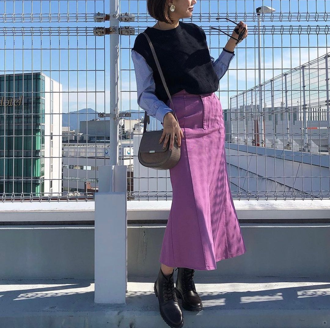 今から着れる春スカートと一枚でキマる、シャツコンビネーションニット。