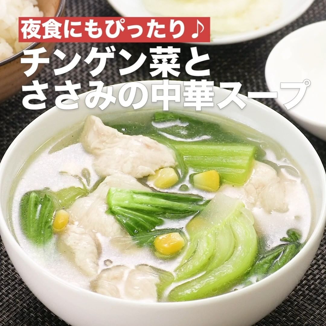 ⑤<夜食にもぴったり♪チンゲン菜とささみの中華スープ>