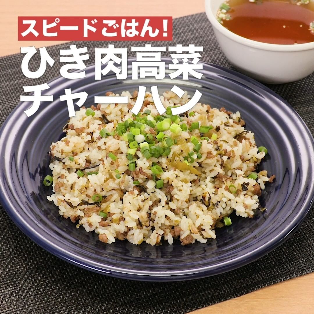 食欲そそる香りが広がる、ひき肉高菜チャーハンのご紹介です。ひき肉、高菜漬け、ごま油の旨味が合わさって、たまらないおいしさ♪卵を加えてもおいしく召し上がれます!ぜひお試しください。