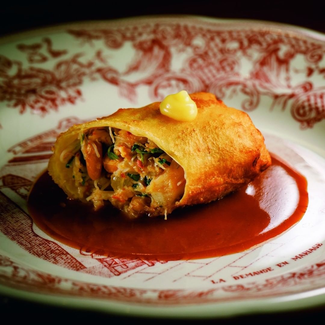 写真②▷毛蟹のほぐし身やエストラゴン、松の実などにピマンデスプレッドでアクセントをつけた「湯葉で巻いた毛蟹のフリット ワタリガニのアメリケーヌソース」。