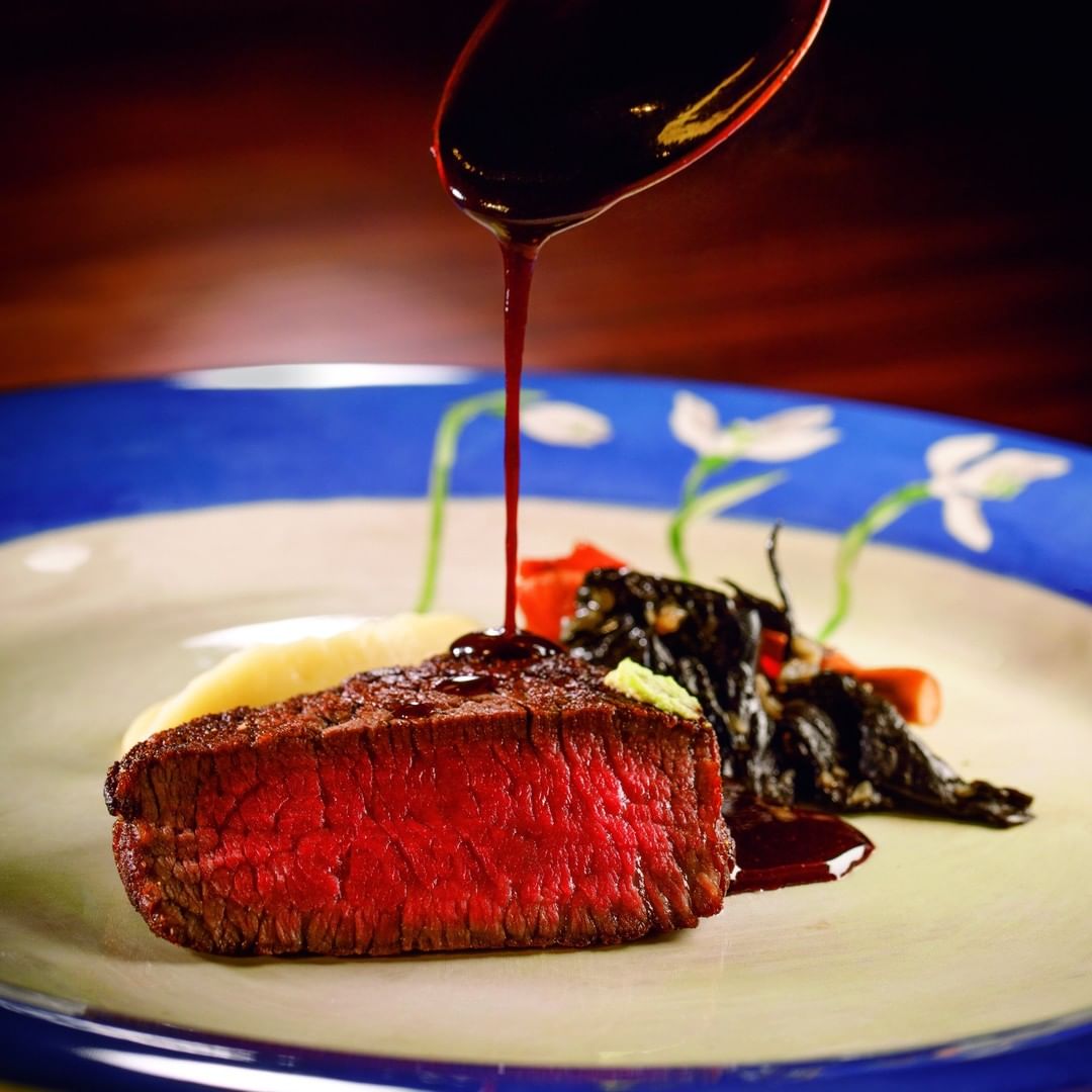 トリプルコンソメにフォン・ド・ヴォーやグラス・ド・ヴィヤンドといった肉の旨味を重ねたソースが牛肉を引き立てる。