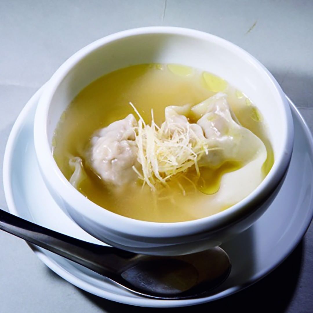 ③▷水餃子ならぬ「富士鶏と豆腐の水焼売」550円。 アンチョビと昆布の出汁、そしてシジミの滋味深いスープとともに。