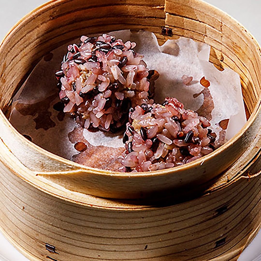 「仔羊と黒米の熟成焼売」は、ヨーロッパではポピュラーな羊肉のソーセージにヒントを得た一品。エキゾティックなスパイスが香る。