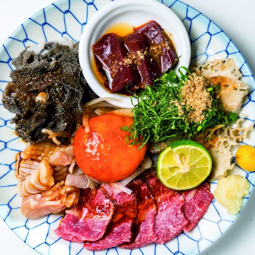 焼肉のもみだれと九州醤油、ごま油をブレンドしたものに漬け込んだ卵黄や、辛子、ニンニクでいただく